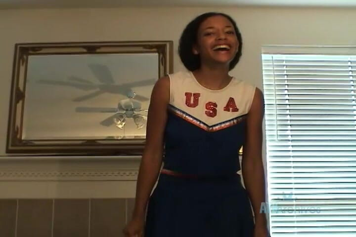 Sexy black babe Grace teases in her cheerleader uniform stripping and rubbing her hairy pussy